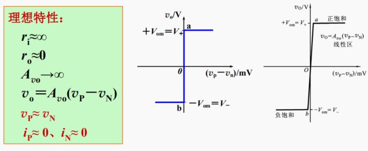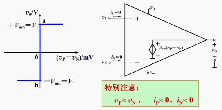 ● 理想的運(yùn)算放大器具有無(wú)窮大的開(kāi)環(huán)增益,無(wú)窮大的輸入電阻和 0 輸出電阻,即:Avo→∞,ri→∞, ro=0。