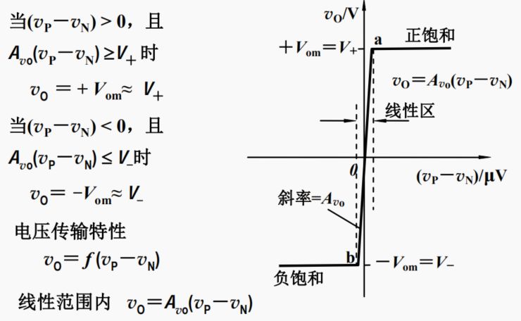 ● 運(yùn)算放大器有兩個(gè)工作區(qū),線性區(qū)和非線性區(qū)。 在線性區(qū),其放大同相輸入端與反相輸入端之間的差值信號(hào)(vP-vN)。 運(yùn)算放大器開(kāi)環(huán)(無(wú)負(fù)反饋)工作時(shí),很容易進(jìn)入非線性區(qū),輸出電壓接近電源電壓。