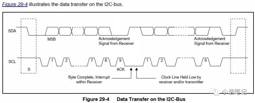 數(shù)據(jù)傳輸格式:SDA線上傳輸?shù)拿總(gè)字節(jié)長度都是8位,每次傳輸中字節(jié)的數(shù)量是沒有限制的,在起始條件后面的第一個(gè)字節(jié)是地址域,之后每個(gè)傳輸?shù)淖止?jié)后面都有一個(gè)應(yīng)答(ACK)位(即一幀共有9位)。傳輸中串行數(shù)據(jù)的MSB(字節(jié)的高位首先發(fā)送)。